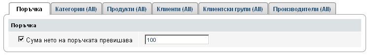 Вие можете да приложите 4 условия за предложение за отстъпка, като използвате 4 раздела: раздел Поръчка, раздел Категории, раздел Продукти и раздел Клиенти.