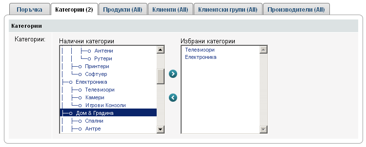 Раздел 'Категории' в страницата 'Редактирайте отстъпка'