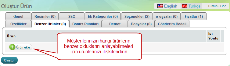 Bü bölümde ürüne istediğiniz kadar benzer ürün ekleyebilirsiniz. Ürünler iki yönlü olarakta ekleyebilirsiniz. İki yönlü kutucuğunu işaretleydıseniz eklediğiniz üründede bu oluşturduğunuz ürün benzer ürün olarak ürün detaylarında görüntülenecek.
