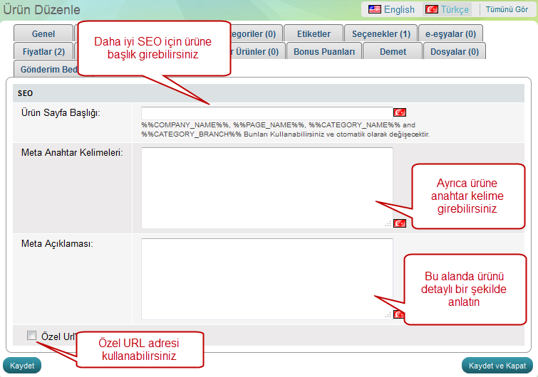 Ürün Sayfa Başlığı: Ürün isminin aynısını girebilirsiniz veya dinamik değişkenleri kullanabilirsiniz: %%COMPANY_NAME%%, %%PAGE_NAME%%, %%CATEGORY_NAME%% ve %%CATEGORY_BRANCH%%.