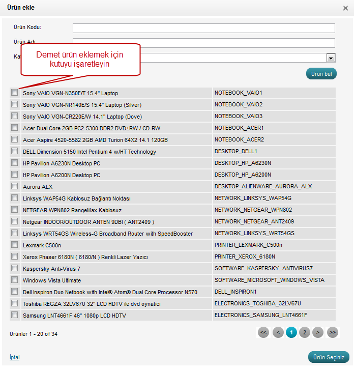 Ürün eklemek için "Ürün ekle" butonuna tıklayınız. Açılan sayfadan ürünü/leri seçebilirsiniz.
