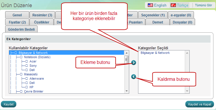 Her bir ürün birden fazla kategoriye eklenebilir ve bunu bu bölümden yapabilirsiniz.