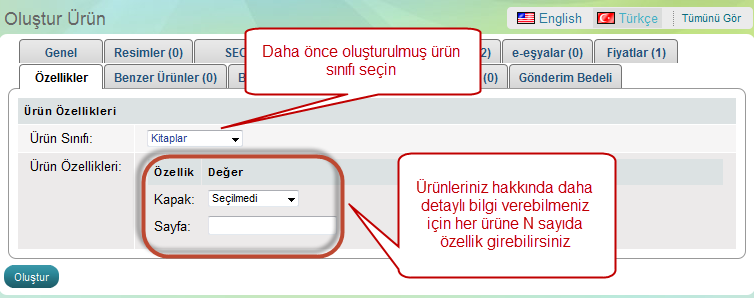 "Genel" bölümünde özelliklerin nasıl olduğunu gördünüz, fakar ürün sınıflarına eklenerek çok daha fazlasını yapabilirler. Bu bolümde ürüne ürün sınıfı ekleyerek çok daha fazla bilgi sunabilirsiniz.