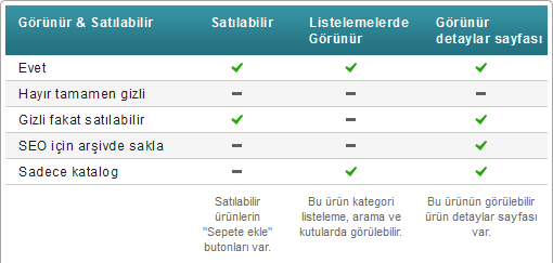 Görünür & Satılabilir: Bu özellik sayesinde Summer Cart size ürünlerinizi göstermenizi, gizlemenizi veya katalog şeklinde barındırma seçeneğini sunuyor. Tabloda daha fazla bilgi mevcuttur.