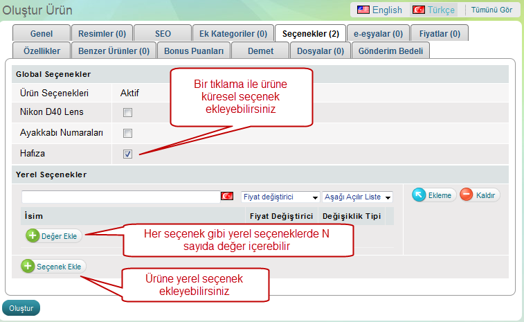 Burada küresel bir seçenek ekleyebilir veya sadece bu ürün için yerel bir seçenek ekleyebilirsiniz.