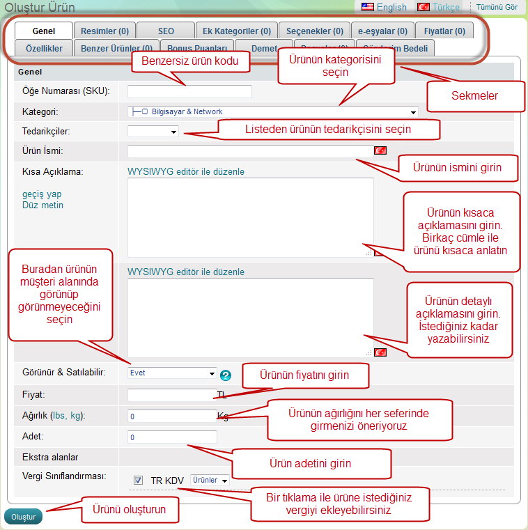 Kategori: Açılan menüden ürünün ait olduğu kategoriyi seçebilirsiniz. Kategoriler sizin tarafınızdan oluşturulur. Burada sistem tüm kategorileri gösteriyor.