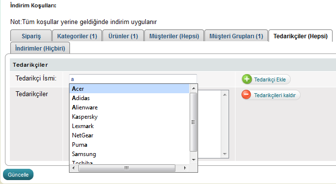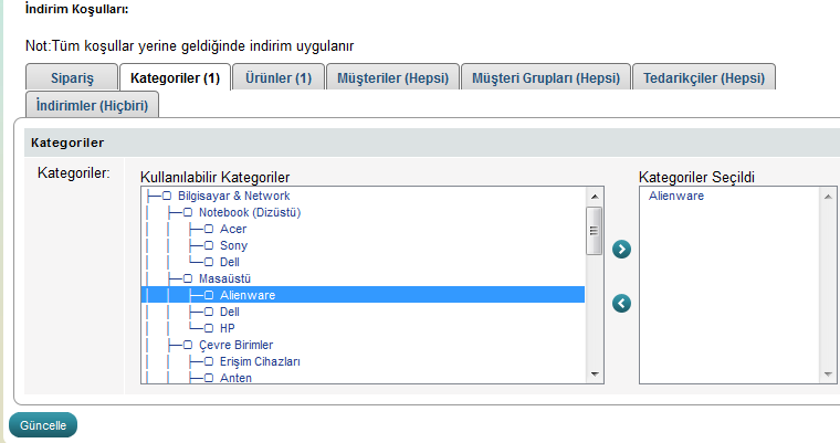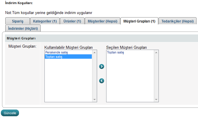 Buradan indirimleri kombine edebilirsiniz. Örneğin 300TL üzeri siparişler için %5 olan indirimi %10 olan Adidas tedarikçisine eklemek istersek bu menüden yapabiliriz. Sol taraftaki listeden eklemek istediğimiz indirimi seçip ok tüşlarını kullanarak sağ taraftaki listeye aktarabilirsiniz.