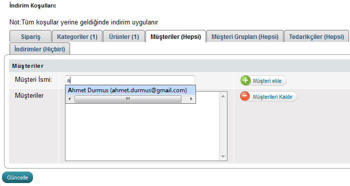 "Müşteri İsmi:" alanına müşterinin ismini(tam ismini veya bir kısmını) girin. Açılır menü şeklinde girilen isimle ilgili tüm sonuclar çıkacak. Müşteriyi seçtikten sonra "Müşteri ekle" butonuna tıklayarak ekleyin. Eklediğiniz müşteri aşağıdaki "Müşteriler" kısmına ekleniyor. "Güncelle" butonuna basarak değişiklikleri kaydedin.