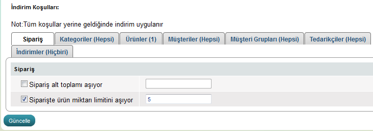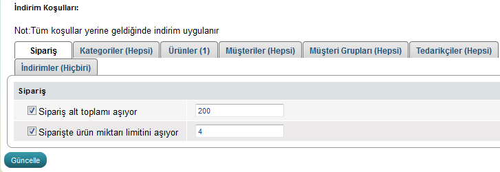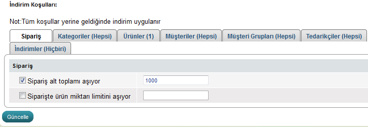 Yükarıdaki örnekte indirim sadece sipariş fiyatının en-az 1000.00 olduğu zaman "Sepete Bak" sayfasında görünecektir.