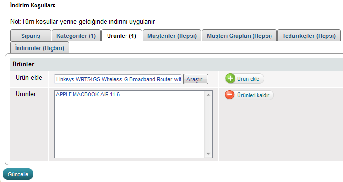 "Araştır" butonuna tiklayin. Tıkladıktan sonra özel bir pop-up sayfa açılacak, ürünleri seçtikten sonra tekrar Ürünler" bölümüne döneceksiniz. Ürünü seçtikten sonra "Ürün ekle" butonuna tıklayarak alttaki "Ürünler" alanına eklersiniz. Değişiklikleri kaydetmek için "Güncelle" butonuna basın.
