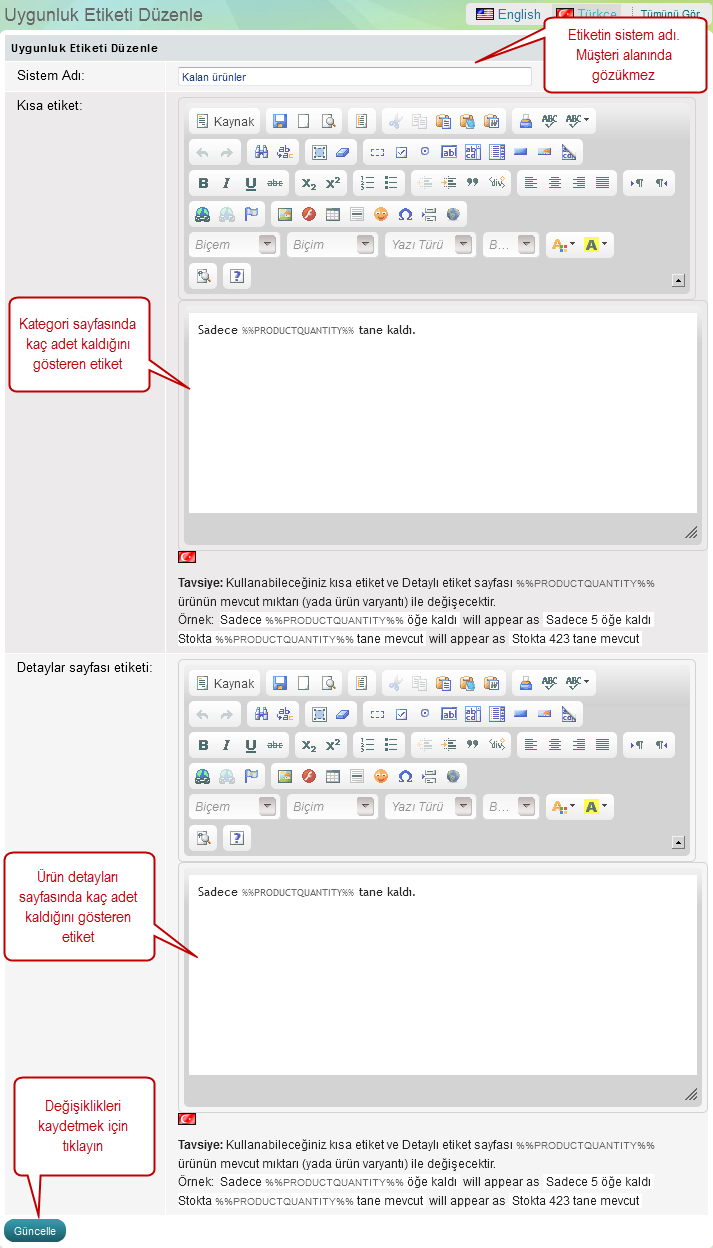 Resimde görüldüğü gibi etikette %%PRODUCTQUANTITY%% değişkenini düzenliyoruz. Bu şekilde sitenin müşteri alanında belirli bir üründe kaç adet kaldığını yazdırabilirsiniz.