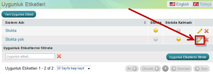 Her etiket düzenlenebilir. Etiket düzenlerken şu alanları değiştirebilirsiniz: "Sistem Adı", "Kısa etiket" ve "Detaylar sayfası etiketi".